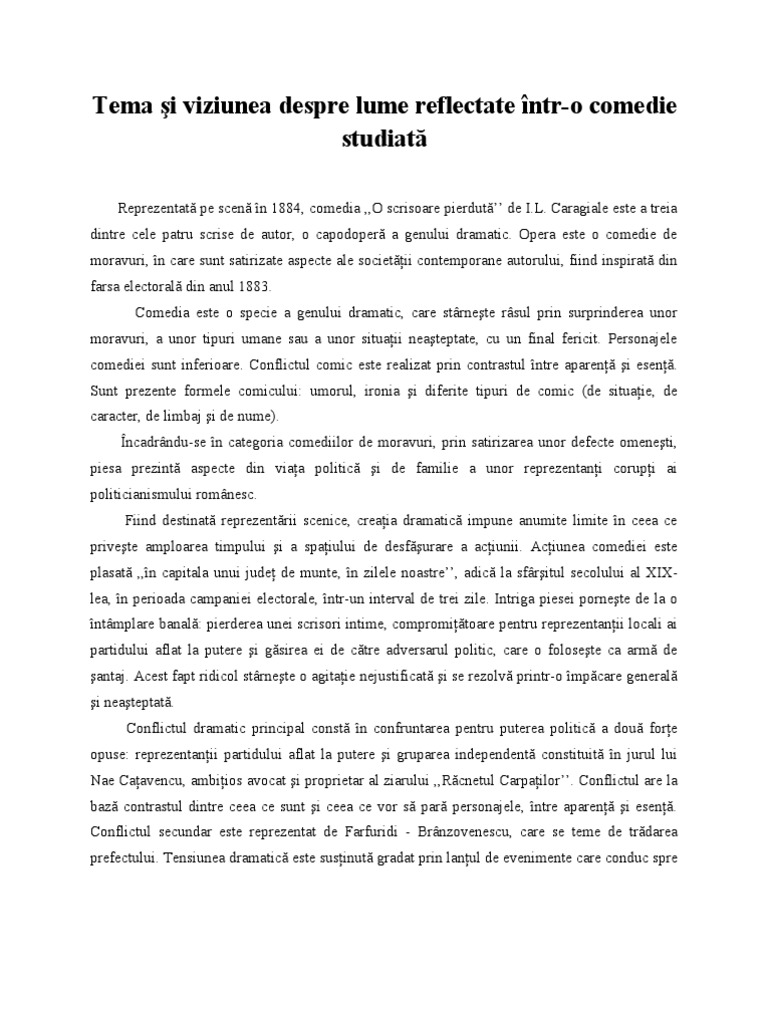 Tema Si Viziunea Despre Lume In Comedia O Scrisoare Pierduta