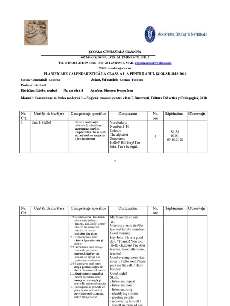 Planificare Calendaristică An Scolar 2019 2020 Clasa 1 Vocabulary Communication