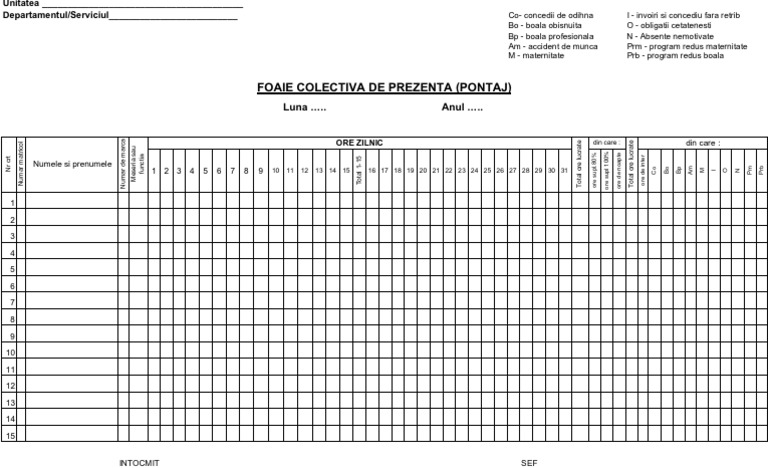 Foaie Colectiva De Prezenta Pontaj Luna Anul