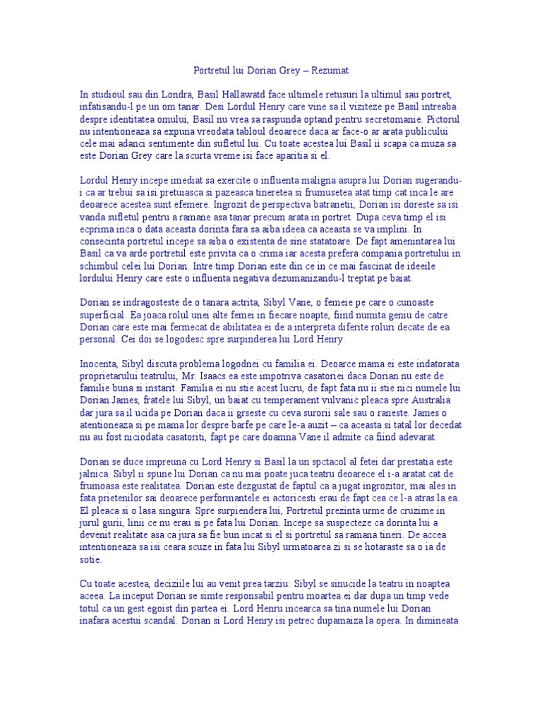 Rezumatul Portretul Lui Dorian Gray In Engleză
