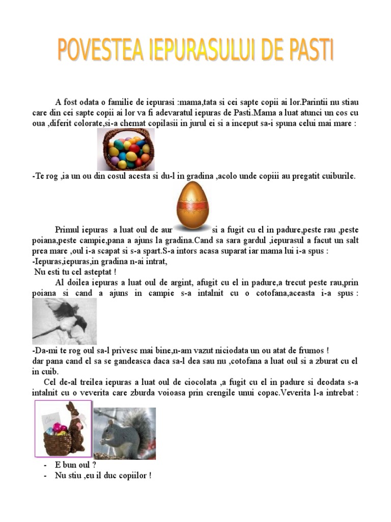 Povestea iepurasului de paste. Iepurasul aducator de oua rosii provine de pe meleaguri germane si simbolizeaza fertilitatea. în dimineaţa primei zile de paşte cei mici plecau plini de speranță în căutarea lor și a. Aceasta poveste o stiu de la gradinita waldorf eu le o spun copiilor in fiecare an si le place foarte mult incercati si voi. Povestea iepurasului de paste se spune ca demult tare demult undeva la o margine de sat traia o mama singura care si crestea cu multe sacrificii dar si cu infinita dragoste cei sapte copilasi ramasi orfani dupa ce un trunchi urias de copac se prabusise peste tatal lor in timpul unei furtuni cumplite care l prinsese in padure.