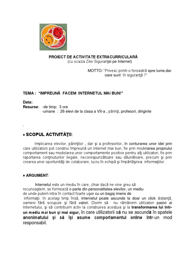 Proiect De Activitate Extracurriculara Tema Impreună Facem Internetul Mai Bun Internetulineducatie