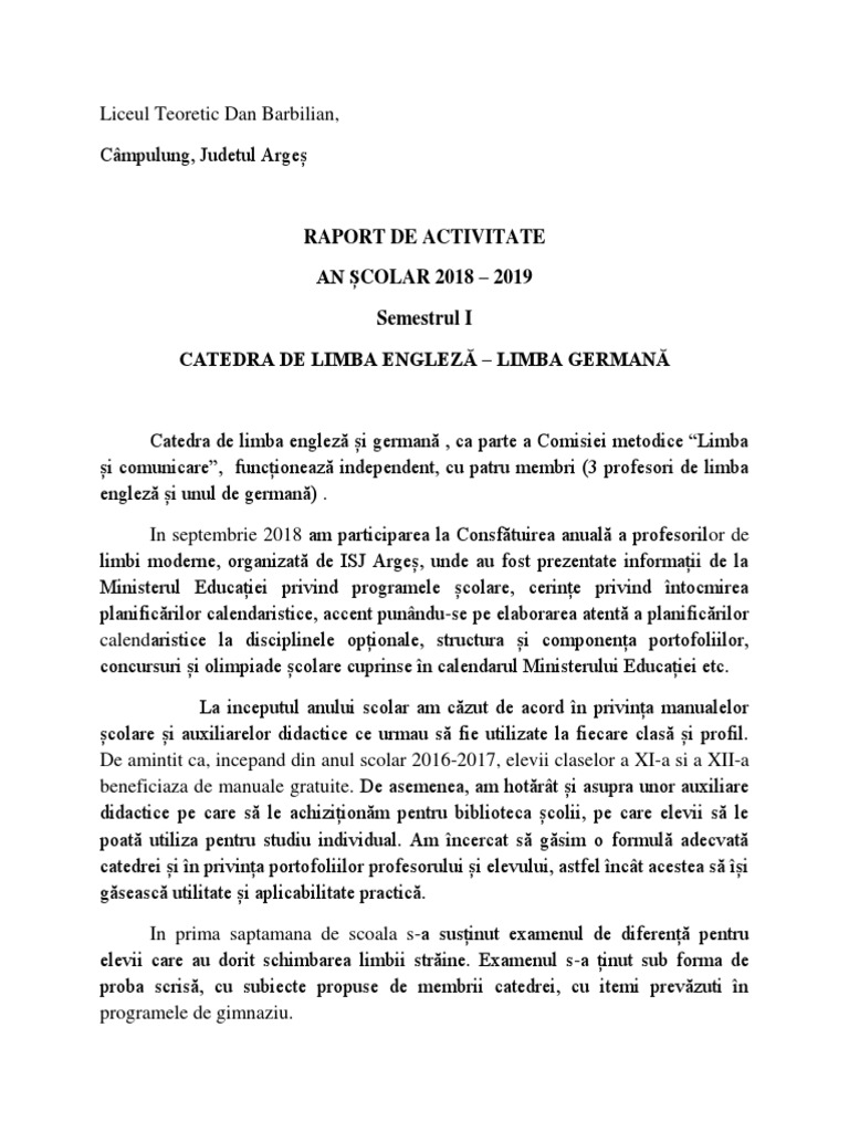 Raport De Activitate An școlar 2018 2019 Semestrul I Catedra De Limba Engleză Limba Germană