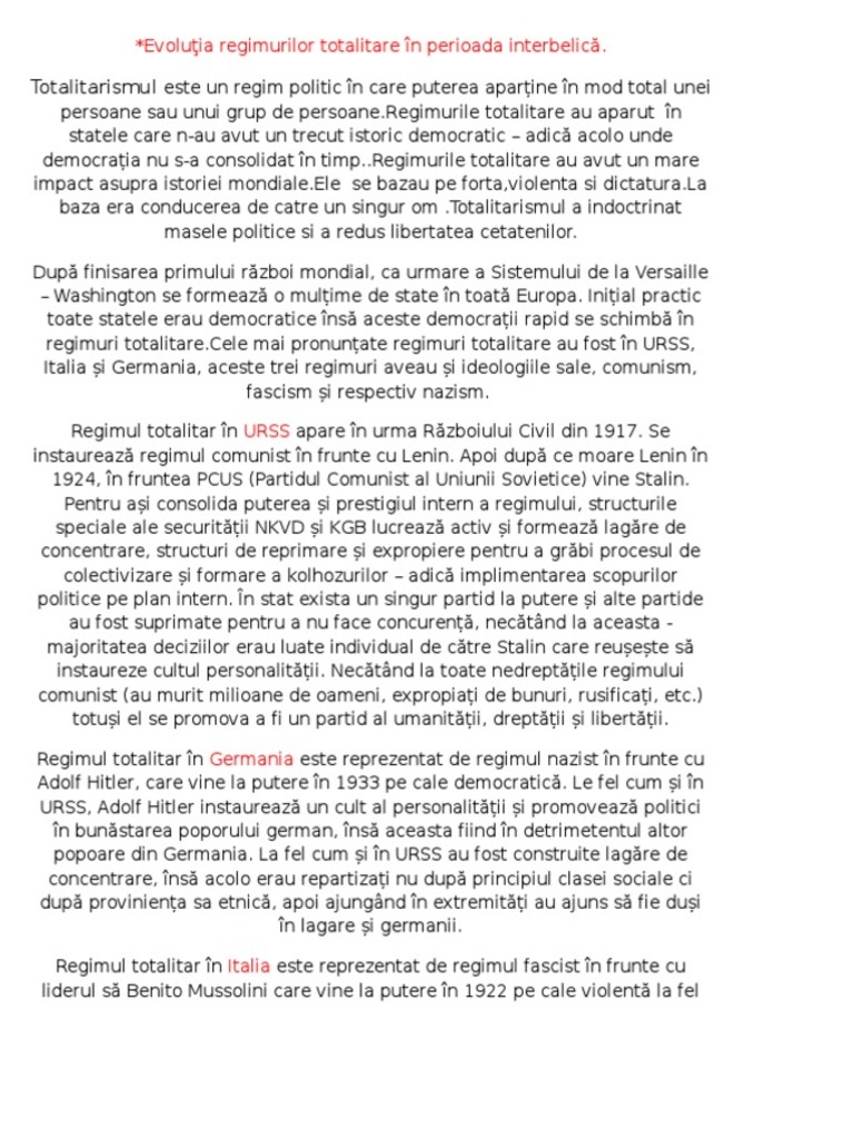 Evolutiile Regimurilor Totalitare In Perioada Interbelica