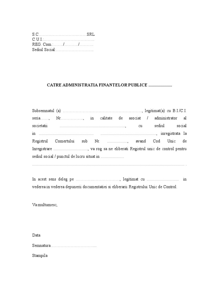 Contribuabilii trebuie să achiziționeze registrul unic de control în termen de 30 zile de la data înregistrării de la direcțiile generale ale finanțelor publice din raza teritorială unde își are sediul social contribuabilul în baza unei documentații fiind necesară și o cerere. Registrul unic de control un rău necesar. 1 registrul unic de control are ca scop evidențierea tuturor controalelor desfășurate la contribuabil de către toate organele de control specializate în domeniile. Este un registru pe care contribuabilii persoane juridice înregistrate la oficiul naţional al registrului comerţului.